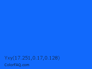 Yxy 17.251,0.17,0.128 Color is a normal blue color and the nearest color is Blue Ribbon #0066ff. Hex code #1169fc and RGB value is rgb(17,105,252). In RGB color space, this color is composed of 7% red, 41% green, 99% blue, In CMYK color space, this color is composed of 93% cyan, 58% magenta, 0% yellow , 1% black , In HSL color space, this color has a hue angle of 218° , 98% saturation and 53% lightness.