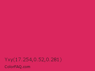 Yxy 17.254,0.52,0.281 Color is a normal rose color and the nearest color is Cerise Red #de3163. Hex code #db265e and RGB value is rgb(219,38,94). In RGB color space, this color is composed of 86% red, 15% green, 37% blue, In CMYK color space, this color is composed of 0% cyan, 83% magenta, 57% yellow , 14% black , In HSL color space, this color has a hue angle of 341° , 72% saturation and 50% lightness.