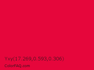 Yxy 17.269,0.593,0.306 Color is a normal red color and the nearest color is Red Ribbon #ed0a3f. Hex code #e6063b and RGB value is rgb(230,6,59). In RGB color space, this color is composed of 90% red, 2% green, 23% blue, In CMYK color space, this color is composed of 0% cyan, 97% magenta, 74% yellow , 10% black , In HSL color space, this color has a hue angle of 346° , 95% saturation and 46% lightness.