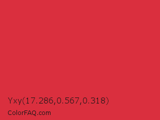 Yxy 17.286,0.567,0.318 Color is a normal red color and the nearest color is Rusty Red #da2c43. Hex code #da2f3e and RGB value is rgb(218,47,62). In RGB color space, this color is composed of 85% red, 18% green, 24% blue, In CMYK color space, this color is composed of 0% cyan, 78% magenta, 72% yellow , 15% black , In HSL color space, this color has a hue angle of 355° , 70% saturation and 52% lightness.
