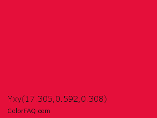 Yxy 17.305,0.592,0.308 Color is a normal red color and the nearest color is Crimson #dc143c. Hex code #e50f3a and RGB value is rgb(229,15,58). In RGB color space, this color is composed of 90% red, 6% green, 23% blue, In CMYK color space, this color is composed of 0% cyan, 93% magenta, 75% yellow , 10% black , In HSL color space, this color has a hue angle of 348° , 88% saturation and 48% lightness.