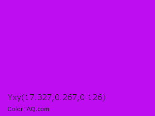 Yxy 17.327,0.267,0.126 Color is a normal purple color and the nearest color is Vivid Mulberry #b80ce3. Hex code #bd0df0 and RGB value is rgb(189,13,240). In RGB color space, this color is composed of 74% red, 5% green, 94% blue, In CMYK color space, this color is composed of 21% cyan, 95% magenta, 0% yellow , 6% black , In HSL color space, this color has a hue angle of 287° , 90% saturation and 50% lightness.