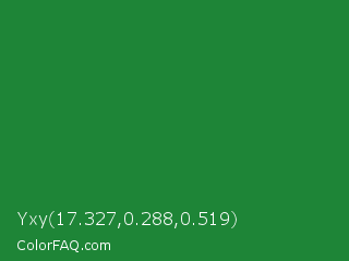 Yxy 17.327,0.288,0.519 Color is a normal green color and the nearest color is Forest Green #228b22. Hex code #1e8537 and RGB value is rgb(30,133,55). In RGB color space, this color is composed of 12% red, 52% green, 22% blue, In CMYK color space, this color is composed of 77% cyan, 0% magenta, 59% yellow , 48% black , In HSL color space, this color has a hue angle of 135° , 63% saturation and 32% lightness.