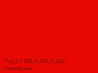 Yxy 17.336,0.637,0.331 Color is a normal red color and the nearest color is KU Crimson #e8000d. Hex code #e80803 and RGB value is rgb(232,8,3). In RGB color space, this color is composed of 91% red, 3% green, 1% blue, In CMYK color space, this color is composed of 0% cyan, 97% magenta, 99% yellow , 9% black , In HSL color space, this color has a hue angle of 1° , 97% saturation and 46% lightness.