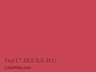 Yxy 17.33,0.5,0.311 Color is a normal red color and the nearest color is Brick Red #cb4154. Hex code #c94555 and RGB value is rgb(201,69,85). In RGB color space, this color is composed of 79% red, 27% green, 33% blue, In CMYK color space, this color is composed of 0% cyan, 66% magenta, 58% yellow , 21% black , In HSL color space, this color has a hue angle of 353° , 55% saturation and 53% lightness.