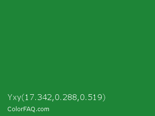 Yxy 17.342,0.288,0.519 Color is a normal green color and the nearest color is Forest Green #228b22. Hex code #1e8537 and RGB value is rgb(30,133,55). In RGB color space, this color is composed of 12% red, 52% green, 22% blue, In CMYK color space, this color is composed of 77% cyan, 0% magenta, 59% yellow , 48% black , In HSL color space, this color has a hue angle of 135° , 63% saturation and 32% lightness.