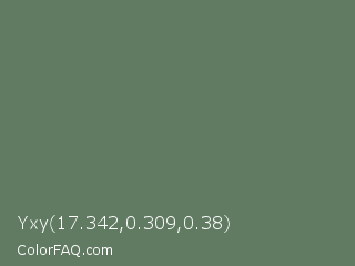 Yxy 17.342,0.309,0.38 Color is a normal green color and the nearest color is Willow Grove #65745d. Hex code #617a62 and RGB value is rgb(97,122,98). In RGB color space, this color is composed of 38% red, 48% green, 38% blue, In CMYK color space, this color is composed of 20% cyan, 0% magenta, 20% yellow , 52% black , In HSL color space, this color has a hue angle of 122° , 11% saturation and 43% lightness.