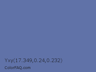 Yxy 17.349,0.24,0.232 Color is a normal blue color and the nearest color is Waikawa Gray #5a6e9c. Hex code #6072a8 and RGB value is rgb(96,114,168). In RGB color space, this color is composed of 38% red, 45% green, 66% blue, In CMYK color space, this color is composed of 43% cyan, 32% magenta, 0% yellow , 34% black , In HSL color space, this color has a hue angle of 225° , 29% saturation and 52% lightness.