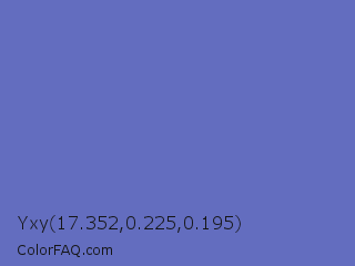 Yxy 17.352,0.225,0.195 Color is a normal blue color and the nearest color is Toolbox #746cc0. Hex code #636dbf and RGB value is rgb(99,109,191). In RGB color space, this color is composed of 39% red, 43% green, 75% blue, In CMYK color space, this color is composed of 48% cyan, 43% magenta, 0% yellow , 25% black , In HSL color space, this color has a hue angle of 233° , 42% saturation and 57% lightness.