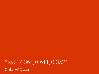 Yxy 17.364,0.611,0.352 Color is a normal red color and the nearest color is Grenadier #d54600. Hex code #da3402 and RGB value is rgb(218,52,2). In RGB color space, this color is composed of 85% red, 20% green, 1% blue, In CMYK color space, this color is composed of 0% cyan, 76% magenta, 99% yellow , 15% black , In HSL color space, this color has a hue angle of 14° , 98% saturation and 43% lightness.