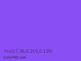 Yxy 17.36,0.219,0.129 Color is a light violet color and the nearest color is Navy Purple #9457eb. Hex code #894ef4 and RGB value is rgb(137,78,244). In RGB color space, this color is composed of 54% red, 31% green, 96% blue, In CMYK color space, this color is composed of 44% cyan, 68% magenta, 0% yellow , 4% black , In HSL color space, this color has a hue angle of 261° , 88% saturation and 63% lightness.