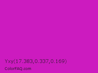 Yxy 17.383,0.337,0.169 Color is a normal magenta color and the nearest color is Steel Pink #cc33cc. Hex code #cc1bbf and RGB value is rgb(204,27,191). In RGB color space, this color is composed of 80% red, 11% green, 75% blue, In CMYK color space, this color is composed of 0% cyan, 87% magenta, 6% yellow , 20% black , In HSL color space, this color has a hue angle of 304° , 77% saturation and 45% lightness.