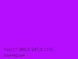 Yxy 17.385,0.247,0.115 Color is a normal purple color and the nearest color is Electric Purple #bf00ff. Hex code #b50eff and RGB value is rgb(181,14,255). In RGB color space, this color is composed of 71% red, 5% green, 100% blue, In CMYK color space, this color is composed of 29% cyan, 95% magenta, 0% yellow , 0% black , In HSL color space, this color has a hue angle of 282° , 100% saturation and 53% lightness.