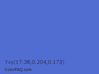 Yxy 17.38,0.204,0.173 Color is a normal blue color and the nearest color is Indigo #4f69c6. Hex code #526dd1 and RGB value is rgb(82,109,209). In RGB color space, this color is composed of 32% red, 43% green, 82% blue, In CMYK color space, this color is composed of 61% cyan, 48% magenta, 0% yellow , 18% black , In HSL color space, this color has a hue angle of 227° , 58% saturation and 57% lightness.