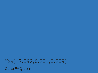 Yxy 17.392,0.201,0.209 Color is a normal blue color and the nearest color is Mariner #286acd. Hex code #3077ba and RGB value is rgb(48,119,186). In RGB color space, this color is composed of 19% red, 47% green, 73% blue, In CMYK color space, this color is composed of 74% cyan, 36% magenta, 0% yellow , 27% black , In HSL color space, this color has a hue angle of 209° , 59% saturation and 46% lightness.