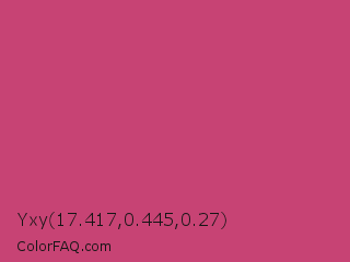 Yxy 17.417,0.445,0.27 Color is a normal rose color and the nearest color is Fuchsia Rose #c74375. Hex code #c74374 and RGB value is rgb(199,67,116). In RGB color space, this color is composed of 78% red, 26% green, 45% blue, In CMYK color space, this color is composed of 0% cyan, 66% magenta, 42% yellow , 22% black , In HSL color space, this color has a hue angle of 338° , 54% saturation and 52% lightness.