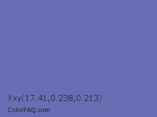 Yxy 17.41,0.238,0.213 Color is a normal blue color and the nearest color is Toolbox #746cc0. Hex code #686eb3 and RGB value is rgb(104,110,179). In RGB color space, this color is composed of 41% red, 43% green, 70% blue, In CMYK color space, this color is composed of 42% cyan, 39% magenta, 0% yellow , 30% black , In HSL color space, this color has a hue angle of 235° , 33% saturation and 55% lightness.