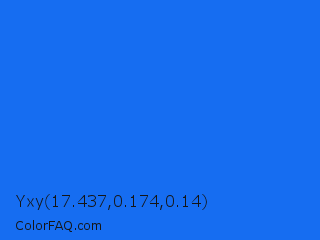 Yxy 17.437,0.174,0.14 Color is a normal blue color and the nearest color is Blue Crayola #1f75fe. Hex code #166df1 and RGB value is rgb(22,109,241). In RGB color space, this color is composed of 9% red, 43% green, 95% blue, In CMYK color space, this color is composed of 91% cyan, 55% magenta, 0% yellow , 5% black , In HSL color space, this color has a hue angle of 216° , 89% saturation and 52% lightness.