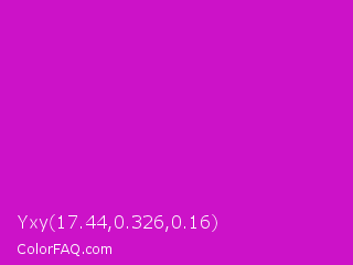 Yxy 17.44,0.326,0.16 Color is a normal magenta color and the nearest color is Deep Magenta #cc00cc. Hex code #cc12c8 and RGB value is rgb(204,18,200). In RGB color space, this color is composed of 80% red, 7% green, 78% blue, In CMYK color space, this color is composed of 0% cyan, 91% magenta, 2% yellow , 20% black , In HSL color space, this color has a hue angle of 301° , 84% saturation and 44% lightness.