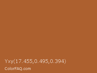 Yxy 17.455,0.495,0.394 Color is a normal orange color and the nearest color is Paarl #a65529. Hex code #ad602f and RGB value is rgb(173,96,47). In RGB color space, this color is composed of 68% red, 38% green, 18% blue, In CMYK color space, this color is composed of 0% cyan, 45% magenta, 73% yellow , 32% black , In HSL color space, this color has a hue angle of 23° , 57% saturation and 43% lightness.