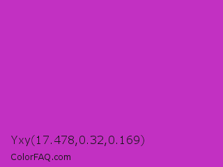 Yxy 17.478,0.32,0.169 Color is a normal magenta color and the nearest color is Steel Pink #cc33cc. Hex code #c230c2 and RGB value is rgb(194,48,194). In RGB color space, this color is composed of 76% red, 19% green, 76% blue, In CMYK color space, this color is composed of 0% cyan, 75% magenta, 0% yellow , 24% black , In HSL color space, this color has a hue angle of 300° , 60% saturation and 47% lightness.