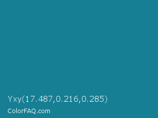 Yxy 17.487,0.216,0.285 Color is a normal cyan color and the nearest color is Metallic Seaweed #0a7e8c. Hex code #167f94 and RGB value is rgb(22,127,148). In RGB color space, this color is composed of 9% red, 50% green, 58% blue, In CMYK color space, this color is composed of 85% cyan, 14% magenta, 0% yellow , 42% black , In HSL color space, this color has a hue angle of 190° , 74% saturation and 33% lightness.