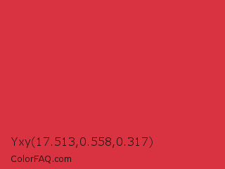 Yxy 17.513,0.558,0.317 Color is a normal red color and the nearest color is Rusty Red #da2c43. Hex code #d93342 and RGB value is rgb(217,51,66). In RGB color space, this color is composed of 85% red, 20% green, 26% blue, In CMYK color space, this color is composed of 0% cyan, 76% magenta, 70% yellow , 15% black , In HSL color space, this color has a hue angle of 355° , 69% saturation and 53% lightness.