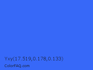 Yxy 17.519,0.178,0.133 Color is a normal blue color and the nearest color is Ultramarine Blue #4166f5. Hex code #3768f8 and RGB value is rgb(55,104,248). In RGB color space, this color is composed of 22% red, 41% green, 97% blue, In CMYK color space, this color is composed of 78% cyan, 58% magenta, 0% yellow , 3% black , In HSL color space, this color has a hue angle of 225° , 93% saturation and 59% lightness.