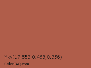 Yxy 17.553,0.468,0.356 Color is a normal red color and the nearest color is Giants Club #b05c52. Hex code #b05d4a and RGB value is rgb(176,93,74). In RGB color space, this color is composed of 69% red, 36% green, 29% blue, In CMYK color space, this color is composed of 0% cyan, 47% magenta, 58% yellow , 31% black , In HSL color space, this color has a hue angle of 11° , 41% saturation and 49% lightness.