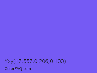 Yxy 17.557,0.206,0.133 Color is a light indigo color and the nearest color is Medium Slate Blue #7b68ee. Hex code #755af4 and RGB value is rgb(117,90,244). In RGB color space, this color is composed of 46% red, 35% green, 96% blue, In CMYK color space, this color is composed of 52% cyan, 63% magenta, 0% yellow , 4% black , In HSL color space, this color has a hue angle of 251° , 88% saturation and 65% lightness.