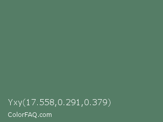 Yxy 17.558,0.291,0.379 Color is a normal green color and the nearest color is Como #517c66. Hex code #557d66 and RGB value is rgb(85,125,102). In RGB color space, this color is composed of 33% red, 49% green, 40% blue, In CMYK color space, this color is composed of 32% cyan, 0% magenta, 18% yellow , 51% black , In HSL color space, this color has a hue angle of 146° , 19% saturation and 41% lightness.
