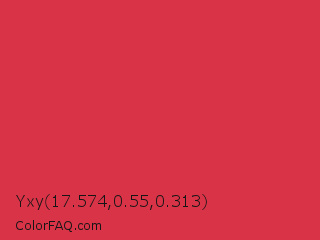 Yxy 17.574,0.55,0.313 Color is a normal red color and the nearest color is Rusty Red #da2c43. Hex code #d93347 and RGB value is rgb(217,51,71). In RGB color space, this color is composed of 85% red, 20% green, 28% blue, In CMYK color space, this color is composed of 0% cyan, 76% magenta, 67% yellow , 15% black , In HSL color space, this color has a hue angle of 353° , 69% saturation and 53% lightness.