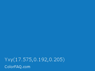 Yxy 17.575,0.192,0.205 Color is a normal blue color and the nearest color is Ocean Boat Blue #0077be. Hex code #1179bf and RGB value is rgb(17,121,191). In RGB color space, this color is composed of 7% red, 47% green, 75% blue, In CMYK color space, this color is composed of 91% cyan, 37% magenta, 0% yellow , 25% black , In HSL color space, this color has a hue angle of 204° , 84% saturation and 41% lightness.