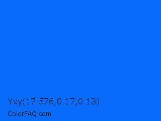 Yxy 17.576,0.17,0.13 Color is a normal blue color and the nearest color is Brandeis Blue #0070ff. Hex code #096bfc and RGB value is rgb(9,107,252). In RGB color space, this color is composed of 4% red, 42% green, 99% blue, In CMYK color space, this color is composed of 96% cyan, 58% magenta, 0% yellow , 1% black , In HSL color space, this color has a hue angle of 216° , 98% saturation and 51% lightness.