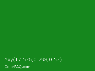 Yxy 17.576,0.298,0.57 Color is a normal green color and the nearest color is Forest Green #228b22. Hex code #15871d and RGB value is rgb(21,135,29). In RGB color space, this color is composed of 8% red, 53% green, 11% blue, In CMYK color space, this color is composed of 84% cyan, 0% magenta, 79% yellow , 47% black , In HSL color space, this color has a hue angle of 124° , 73% saturation and 31% lightness.