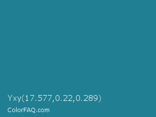 Yxy 17.577,0.22,0.289 Color is a normal cyan color and the nearest color is Jelly Bean #297b9a. Hex code #207f92 and RGB value is rgb(32,127,146). In RGB color space, this color is composed of 13% red, 50% green, 57% blue, In CMYK color space, this color is composed of 78% cyan, 13% magenta, 0% yellow , 43% black , In HSL color space, this color has a hue angle of 190° , 64% saturation and 35% lightness.