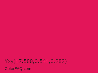 Yxy 17.588,0.541,0.282 Color is a normal rose color and the nearest color is Ruby #e0115f. Hex code #e31559 and RGB value is rgb(227,21,89). In RGB color space, this color is composed of 89% red, 8% green, 35% blue, In CMYK color space, this color is composed of 0% cyan, 91% magenta, 61% yellow , 11% black , In HSL color space, this color has a hue angle of 340° , 83% saturation and 49% lightness.
