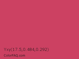 Yxy 17.5,0.484,0.292 Color is a normal red color and the nearest color is Brick Red #cb4154. Hex code #cc4162 and RGB value is rgb(204,65,98). In RGB color space, this color is composed of 80% red, 25% green, 38% blue, In CMYK color space, this color is composed of 0% cyan, 68% magenta, 52% yellow , 20% black , In HSL color space, this color has a hue angle of 346° , 58% saturation and 53% lightness.