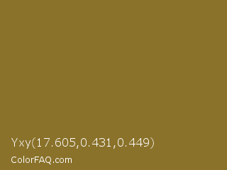 Yxy 17.605,0.431,0.449 Color is a normal orange color and the nearest color is Spanish Bistre #807532. Hex code #8a722a and RGB value is rgb(138,114,42). In RGB color space, this color is composed of 54% red, 45% green, 16% blue, In CMYK color space, this color is composed of 0% cyan, 17% magenta, 70% yellow , 46% black , In HSL color space, this color has a hue angle of 45° , 53% saturation and 35% lightness.