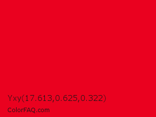 Yxy 17.613,0.625,0.322 Color is a normal red color and the nearest color is Cadmium Red #e30022. Hex code #ea011f and RGB value is rgb(234,1,31). In RGB color space, this color is composed of 92% red, 0% green, 12% blue, In CMYK color space, this color is composed of 0% cyan, 100% magenta, 87% yellow , 8% black , In HSL color space, this color has a hue angle of 352° , 99% saturation and 46% lightness.