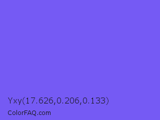 Yxy 17.626,0.206,0.133 Color is a light indigo color and the nearest color is Medium Slate Blue #7b68ee. Hex code #755af4 and RGB value is rgb(117,90,244). In RGB color space, this color is composed of 46% red, 35% green, 96% blue, In CMYK color space, this color is composed of 52% cyan, 63% magenta, 0% yellow , 4% black , In HSL color space, this color has a hue angle of 251° , 88% saturation and 65% lightness.