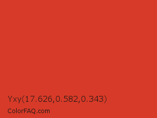 Yxy 17.626,0.582,0.343 Color is a normal red color and the nearest color is Vermilion #d9381e. Hex code #d73a28 and RGB value is rgb(215,58,40). In RGB color space, this color is composed of 84% red, 23% green, 16% blue, In CMYK color space, this color is composed of 0% cyan, 73% magenta, 81% yellow , 16% black , In HSL color space, this color has a hue angle of 6° , 69% saturation and 50% lightness.