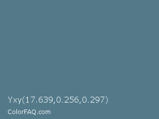 Yxy 17.639,0.256,0.297 Color is a normal blue color and the nearest color is Smalt Blue #51808f. Hex code #547a8a and RGB value is rgb(84,122,138). In RGB color space, this color is composed of 33% red, 48% green, 54% blue, In CMYK color space, this color is composed of 39% cyan, 12% magenta, 0% yellow , 46% black , In HSL color space, this color has a hue angle of 198° , 24% saturation and 44% lightness.