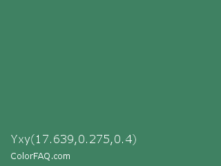 Yxy 17.639,0.275,0.4 Color is a normal green color and the nearest color is Viridian #40826d. Hex code #3f8162 and RGB value is rgb(63,129,98). In RGB color space, this color is composed of 25% red, 51% green, 38% blue, In CMYK color space, this color is composed of 51% cyan, 0% magenta, 24% yellow , 49% black , In HSL color space, this color has a hue angle of 152° , 34% saturation and 38% lightness.