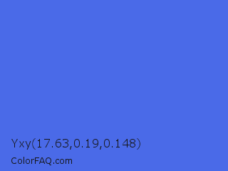 Yxy 17.63,0.19,0.148 Color is a normal blue color and the nearest color is Royal Blue #4169e1. Hex code #4a6ae8 and RGB value is rgb(74,106,232). In RGB color space, this color is composed of 29% red, 42% green, 91% blue, In CMYK color space, this color is composed of 68% cyan, 54% magenta, 0% yellow , 9% black , In HSL color space, this color has a hue angle of 228° , 77% saturation and 60% lightness.