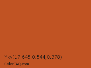 Yxy 17.645,0.544,0.378 Color is a normal orange color and the nearest color is Orange Roughy #c45719. Hex code #c15323 and RGB value is rgb(193,83,35). In RGB color space, this color is composed of 76% red, 33% green, 14% blue, In CMYK color space, this color is composed of 0% cyan, 57% magenta, 82% yellow , 24% black , In HSL color space, this color has a hue angle of 18° , 69% saturation and 45% lightness.