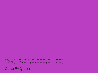Yxy 17.64,0.308,0.173 Color is a normal magenta color and the nearest color is Fuchsia Pink #c154c1. Hex code #b93ec2 and RGB value is rgb(185,62,194). In RGB color space, this color is composed of 73% red, 24% green, 76% blue, In CMYK color space, this color is composed of 5% cyan, 68% magenta, 0% yellow , 24% black , In HSL color space, this color has a hue angle of 296° , 52% saturation and 50% lightness.