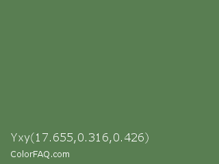 Yxy 17.655,0.316,0.426 Color is a normal green color and the nearest color is Hippie Green #53824b. Hex code #597e52 and RGB value is rgb(89,126,82). In RGB color space, this color is composed of 35% red, 49% green, 32% blue, In CMYK color space, this color is composed of 29% cyan, 0% magenta, 35% yellow , 51% black , In HSL color space, this color has a hue angle of 110° , 21% saturation and 41% lightness.