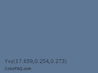 Yxy 17.659,0.254,0.273 Color is a normal blue color and the nearest color is Waikawa Gray #5a6e9c. Hex code #5d7794 and RGB value is rgb(93,119,148). In RGB color space, this color is composed of 36% red, 47% green, 58% blue, In CMYK color space, this color is composed of 37% cyan, 20% magenta, 0% yellow , 42% black , In HSL color space, this color has a hue angle of 212° , 23% saturation and 47% lightness.