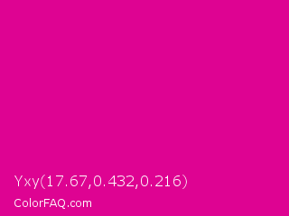 Yxy 17.67,0.432,0.216 Color is a normal magenta color and the nearest color is Mexican Pink #e4007c. Hex code #de0392 and RGB value is rgb(222,3,146). In RGB color space, this color is composed of 87% red, 1% green, 57% blue, In CMYK color space, this color is composed of 0% cyan, 99% magenta, 34% yellow , 13% black , In HSL color space, this color has a hue angle of 321° , 97% saturation and 44% lightness.